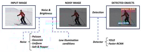 Figure 3 offers a graphical abstract of how the study proposed in this work was conducted. First, the raw image is contaminated with a source of noise. Additionally, a brightness scale factor is applied to emulate low-illumination conditions. Therefore, after both noise and brightness processes, a noisy image is obtained. Next, that image is supplied to a detector method in order to locate and classify the objects presented in that image. Once the detections of all tuned configurations have been performed, a fair comparison has been carried out by using different well-known metrics. Finally, the obtained results from that comparison can be discussed.