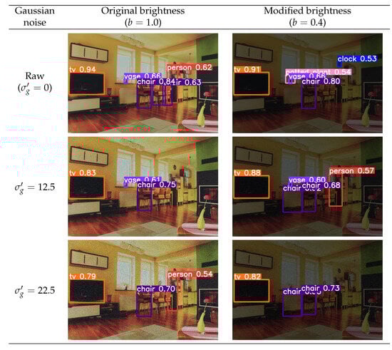 However, in general, a more noisy image produces fewer detections and lower confidence in the model. As shown, the television is well detected in all images; nevertheless, the higher the quantity of noise, the lower the confidence of the method in that detection. This effect is more visible in the case of the vase, which is recognized in the absence of noise or with a low quantity of noise, but it is not detected when the noise is much higher.