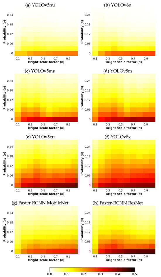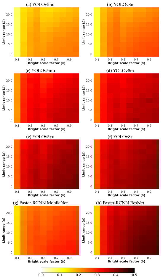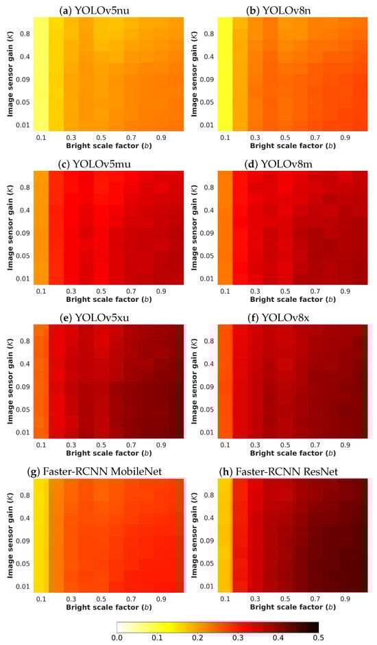 The overall results for Poisson noise are shown in Figure 6. From this figure, it can be deduced that the Faster-RCNN ResNet model achieves the best performance. Furthermore, this degradation is more perceptible for the lowest values of the bright scale. In these cases, YOLOv5xu performs better.