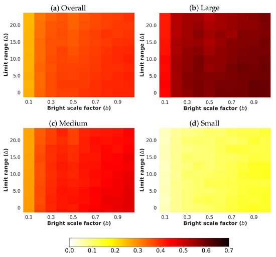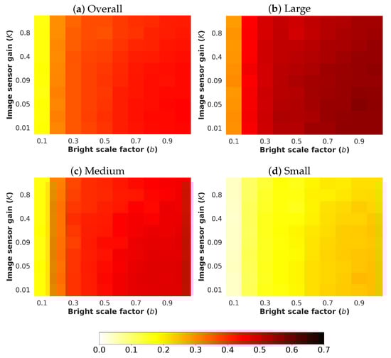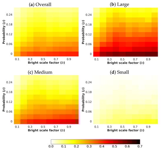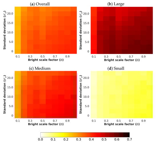 Next, an analysis and comparison have been performed for each type of considered noises. For each type of noise, the performance of each detector (methods are detailed in Section 4.1) is shown according to the quantity of noise and the brightness of the image (considered values are described in Section 4.3). The performance is reported in terms of mAP, which is considered the primary challenge metric by the COCO dataset. This measure provides values between 0 and 1, where higher is better. To better understand the effect of noise and brightness, the performance yielded by each method for each kind of noise is reported using a heatmap, where the performance for each configuration of noise and brightness is detailed. Two figures each from Figure 6, Figure 7, Figure 8, Figure 9, Figure 10, Figure 11, Figure 12 and Figure 13 show the results for Poisson, Gaussian, salt-and-pepper, and uniform noises, respectively. For each type of noise, the first figure describes the performance of the methods by considering the overall size of the ground-truth objects, while the second one details the performance of a selected method across small, medium, and large sizes. With the aim of not overcharging this study with the performance across scales small, medium, and large sizes for all selected methods, only the most significant method for each noise is exhibited. Note that the configuration with corresponds with no synthetic low-illumination conditions.