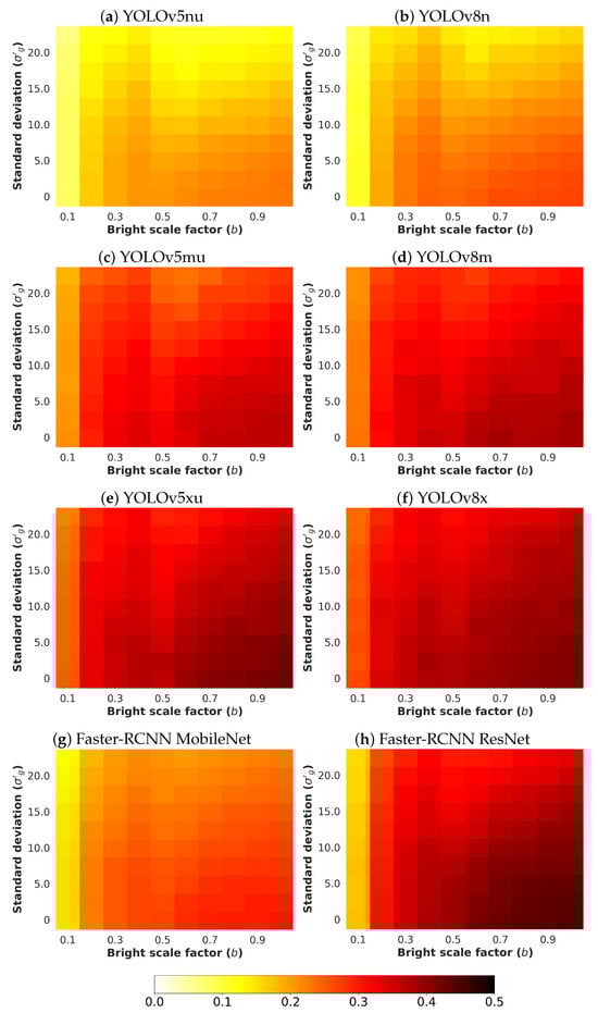 Figure 8 shows the results for Gaussian noise. As can be observed, YOLOv8x has the best performance. The performance degradation is proportional to the standard deviation for every bright scale value. Moreover, this deterioration is more noticeable in the lowest-illumination conditions. This is because the quantity of noise introduced for each pixel is comparable with the maximum pixel value of the input image.