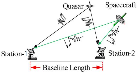 ΔDOR is one of the commonly used VLBI technology systems, the fundamental principle of which is illustrated in Figure 1. Two distant stations, denoted as Station-1 and Station-2 in Figure 1, establish an interferometry baseline, with the distance between them referred to as the baseline length. The two stations simultaneously observe the spacecraft or the reference radio source alternately during a ∆DOR measurement. The radio source measurement serves to eliminate the system’s linear error, thereby facilitating the acquisition of precise interferometry time delay measurements for the spacecraft.