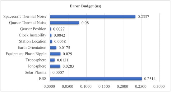 The error budget for the X-band ΔDOR in the CDSN interferometry system with the above conditions is shown in Figure 2, where RSS stands for the Root Sum Square of all the above ten errors and is always used as a system’s total error criterion. As is evident from Figure 2, spacecraft thermal noise emerges as the predominant error source, accounting for approximately 93% of the overall error effect. The thermal noise error, which is believed to be a random error source, can be calculated using Formula (1) [27,28], where Δf represents the effective bandwidth, and hardly changes under the CCSDS specification, and T is the integration time, P/N0 being the carrier-to-noise power density ratio, which is related to the downlink signal power. Consequently, primary strategies to eliminate thermal noise encompass enhancing the effective bandwidth, increasing the integration time, and optimizing the carrier-to-noise ratio. Notably, the effective bandwidth is limited by the CCSDS standard; specifically, the S-band and X-band effective bandwidths for VLBI are approximately 7.5 MHz and 40 MHz, respectively. The carrier-to-noise ratio is related to the downlink signal power and the receiving performance of the ground station. Since the receiving performance of the ground station is usually stable and has little room to improve, the carrier-to-noise ratio is directly affected by the downlink signal power.