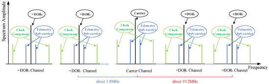 Currently, recommended as ranging pseudo-codes by the CCSDS [30], T4B and T2B are both generated by combining six identical codes with different logistics. The primary distinction between these two lies in that the weight of the clock component of the T4B code is double that of the T2B code. The frequency of the PN code ranging clock tone component is about 0.5 MHz or about 1 MHz when the PN code rate is 1 Mchips/s or 2 Mchips/s. In addition, according to the CCSDS standard, only one group of DOR beacon signals is set in the S-band, and the frequency spacing between the DOR signal and the carrier is 1/600 of RF frequency, which is about 3.7 MHz when the RF frequency is 2.25 GHz. Two sets of DOR beacon signals are allocated in the X-band, and the frequency spacings are 1/2200 (corresponding to DOR1) and 1/440 (corresponding to DOR2) of RF frequency, respectively, which are about 3.8 MHz and 19.2 MHz when the radio frequency is 8.45 GHz. The X-band downlink signal spectrum construction of a typical deep spacecraft is shown in Figure 3.
