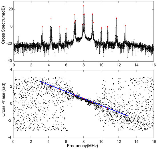 The cross-spectrum and the corresponding fringe can be obtained by correlation processing, which are shown in Figure 5. It can be seen that the structure of the signal cross-spectrum is basically consistent with that in Figure 3. The red cycles and blue solid line in the lower half of Figure 5 indicate that the carrier and clock components of the PN code ranging signal, as well as the DOR beacon signals, exhibit clear fringes. The corresponding cross-spectrum phases are linearly distributed, which conforms to the principle described in reference [2].