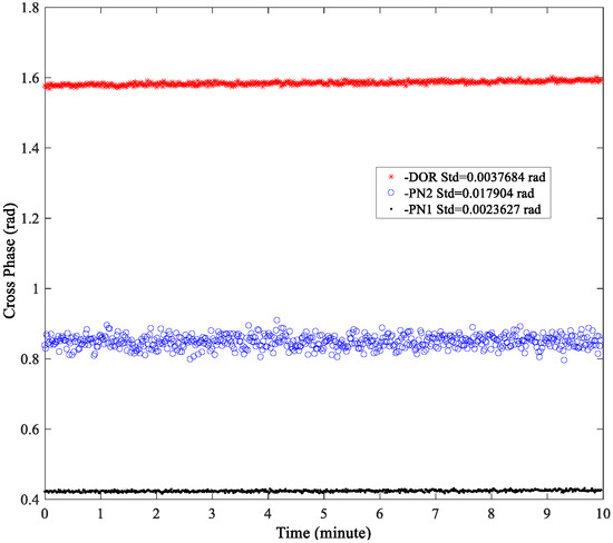 Due to the relatively high carrier-to-noise ratio of the carrier signal, the random accuracy of the interference time delay primarily depends on either the DOR beacon signal or the clock component of the PN code ranging signal. The cross-spectrum phase is shown in Figure 11. The trends of the cross-spectrum phase of the three signals are consistent, with their random accuracies closely aligned. However, the random error of the DOR signal is relatively larger. This is consistent with the analyzed results of the carrier-to-noise ratio shown in Figure 10. The phase estimation accuracy of the three signals satisfies the criteria outlined in Equation (7).