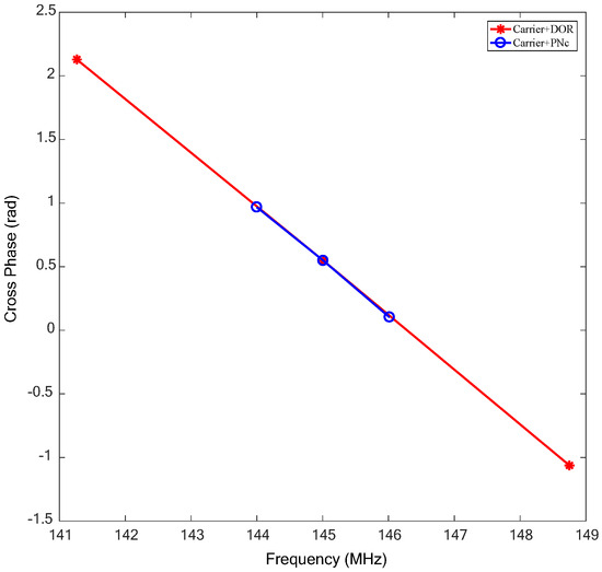 Suppose that f1, f2 correspond to the two frequencies of the signals in Figure 3, for instance, the carrier and −DOR1 signal, and φ1, φ2 are the corresponding cross-spectrum phases, then, the time delay can be estimated by Formula (2):