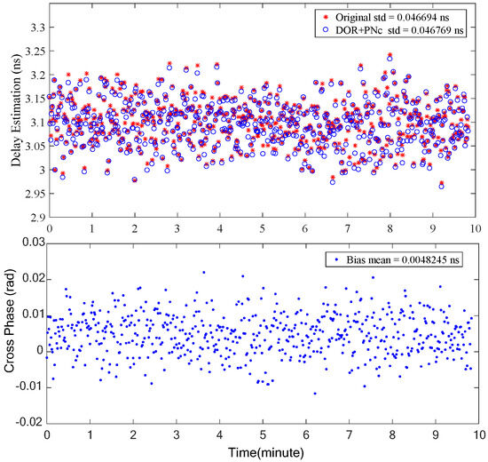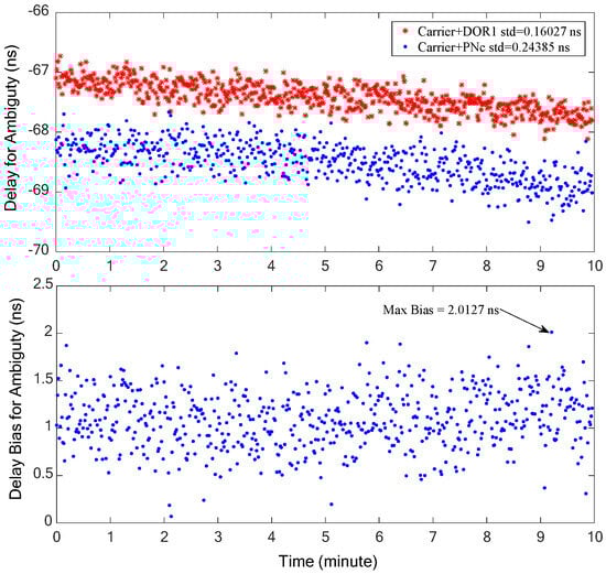 In order to resolve the possible cross-phase ambiguity of ±19.2 MHz DOR beacons, two signal combinations, carrier–DOR1 (the traditional processing method) and carrier–PN code clock components (the proposed method in this paper), are used to estimate the coarse interferometry time delay, respectively. The coarse time delay estimation results of the two signal combinations are shown in Figure 12, in which the upper half shows the estimation results and the lower half is their deviation. It is evident that the carrier–DOR1 combination offers superior coarse time delay accuracy. This superiority can be attributed to the relatively larger frequency interval (namely effective bandwidth) of carrier–DOR1, approximately 3.85 MHz, compared to the narrower frequency interval of about 1 MHz when employing the PN code clock component. Given the equivalent random accuracy of the phase estimation, as illustrated in Figure 11, a wider effective bandwidth corresponds to the increased random accuracy of the time delay. It can be seen from the lower half of Figure 12 that the maximum deviation of the two coarse time delay estimation results is about 4.8 ns, which is almost equal to three times that of the random accuracy of the interference delay of the PN code clock component, verifying the analysis in Section 2. The cross-spectral phase deviation generated by this time delay deviation at a ±19.2 MHz DOR signal is about 0.1 cycles (2π), which does not affect the final integer ambiguity resolution result.
