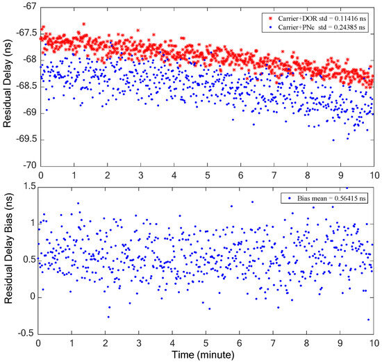 The combination of the carrier and one DOR beacon signal, as processed traditionally, is denoted as Carrier+DOR1. On the other hand, the combination of the clock component of the carrier and PN code ranging signal under the proposed method is represented as Carrier+PNc. Both methods are employed for frequency synchronization, respectively, to obtain the coarse time delay estimation, thereby resolving the integer ambiguity of the ±DOR1 signal cross-spectrum phase. The residual delays of the two situations and their bias are shown in the upper and lower half of Figure 8. It can be seen that the trends of the time delay obtained by the two signal combinations are consistent. The accuracy of the time delay obtained by the Carrier+DOR1 combination is relatively higher than that of the Carrier+PNc combination. This is mainly due to the fact that the wider the effective synchronization bandwidth, the higher the accuracy of the time delay when the accuracy of the cross-spectrum phase is close. The residual delay bias obtained by the two combinations is relatively stable, peaking at approximately 2 ns, which results in a maximum bias of about 0.015 cycles (2π) and 0.08 cycles in the cross-spectrum phase when the bandwidth are about 7.5 MHz and 40 MHz, respectively. In other words, this time delay bias will not introduce the deviation of integer ambiguity resolution, and the time delay estimation results must be consistent with the traditional scheme.