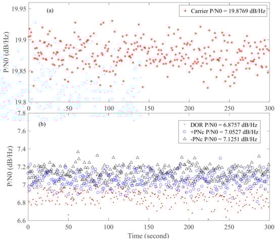 The carrier-to-noise ratio estimation results of carrier ((a), upper half), PN code ranging clock components (−PNc, +PNc), and DOR beacon signals ((b), lower half).