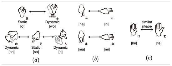 Example of (a) The same hand shape, but different meanings depending on the movement (b) Same hand shape, but different meanings depending on the angle (c) Example of similar shape て (te) and け (ke).