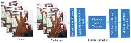 The workflow diagram for our proposed study is illustrated in Figure 2. This diagram outlines the key steps we followed in our research. Firstly, we recorded the dataset using an RGB camera. Subsequently, we employed the Mediapipe hand pose detection approach to extract the key points of the hand. Each video in our study consists of approximately 12 frames, and we segmented these frames into four groups. We extracted four types of features from each of these groups using geometrical and mathematical formulas. These features encompass distance, angle, motion, and finger direction. Once we concatenated these features, we applied a machine-learning approach for classification and analysis.