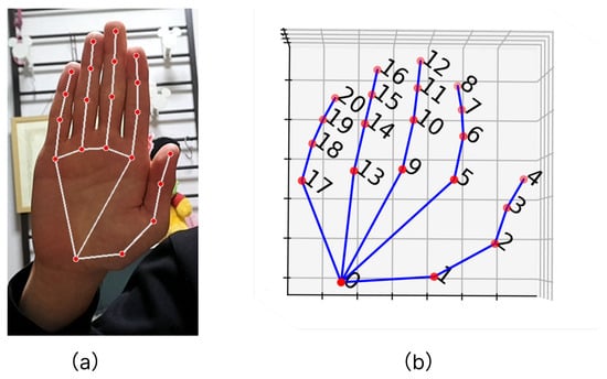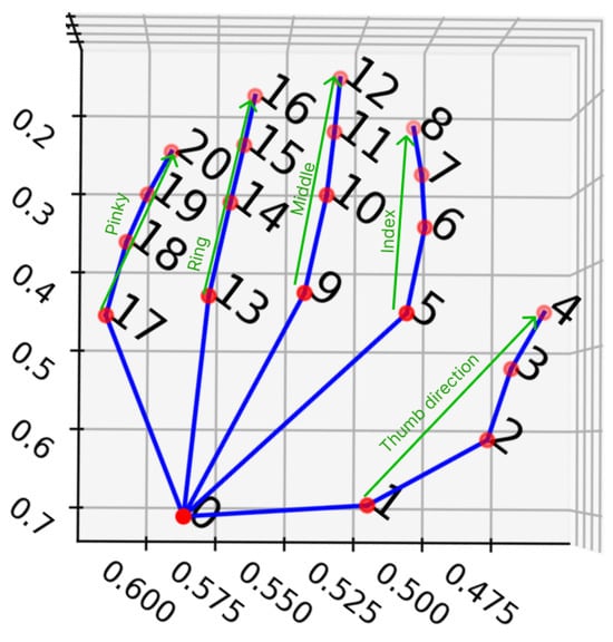 To generate feature values, coordinate data are extracted from images using a hand-shape estimator called MediaPipe [34]. When images containing the hand are processed, they yield x, y, and z coordinate data for 21 landmarks on the hand as real numbers. The landmarks follow a specific order, as illustrated in Figure 3a,b.