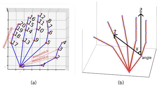 Importantly, angle features are independent of hand size, like distance-based features. This eliminates the impact of the size-related variation. The angle feature calculation formula initially determines the direction vector between two points. Subsequently, it calculates the angle between the vectors using the direction vector and the vector in the X, Y, and Z-axis directions. Let us denote two vectors as and . The angle feature between these spatial vectors is calculated using Equation (5). To calculate the angle from the X-axis, we set vector as (1, 0, 0) in the X-direction, as expressed in Equation (6). Similarly, the formula for calculating the angle from the Y-axis and Z-axis involves setting vector as (0, 1, 0) and (0, 0, 1) in the Y-axis and Z-axis directions, respectively, as shown in Equations (4)–(7). Table 5 provides an example of angle-based features.