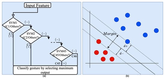 SVM is used for machine learning classification and is also used for hand pose recognition in [39] by Phat Nguyen Huu and Tan Phung Ngoc. The training will compute the support vector that will divide the 46 labels this time. To classify the 46 labels in this study, we used a multiclass SVM as in [40]. We use the usual binary classification SVM and introduce (OVR) for classifying one versus the other and assign the class classified with the highest output function. By repeating this process, the SVM classified 46 classes. As shown in Figure 8a,b below, the OVR SVMs operated in parallel, separating one class from the others and measuring the largest one.