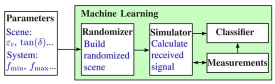 The simulation environment presented here refers to the system we proposed in []. This is a handheld M-sequence radar device that emits electromagnetic waves in the low-frequency range of up to . In general, however, the underlying simulation approach is independent of the radar system and can also be applied to other frequency ranges. Therefore, the presented simulation approach allows modeling the received signals of future modern radar sensors in numerous applications. Figure 1 shows the basic principle of the proposed training process. The describing parameters of the environment, like the relative permittivity , and the parameters of the measurement system are passed to a randomizer. This generates a random scenario of the environment, which is used to calculate the received signal by means of a full-wave simulation. The simulation results are validated by measurements of the sensing environment to ensure that the simulated data match the measured data with sufficient accuracy. Afterward, the simulated data and the true measurements are used to train the classifier.