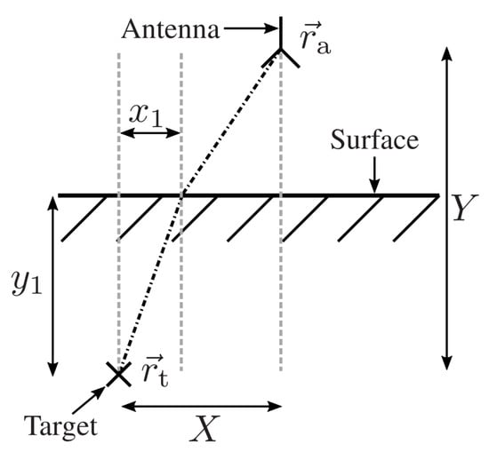 The found formula is a straightforward solution for the imaging problem. However, backprojection of the range-compressed signal relies on the modeling of the wave propagation and the according round-trip time . In case of a GPR system, the surrounding medium is inhomogeneous, where the refraction effects at the earth surface and varying propagation speeds have to be taken into account. Therefore, provided that the soil permittivity is known a priori, the main problem is to find the refraction point on the earth surface. As was shown in [], this can be achieved by evaluating Snell’s law. Figure 2 shows the measurement scenario of an antenna located at  over the soil material and the observation point  below the earth surface. We denote the overall horizontal distance between the antenna and the observation point with X and the horizontal distance between  and the refraction point with . Similarly, Y denotes the vertical distance between the antenna and the observation point, and  is the distance between  and the earth surface. In reference to Figure 2, the problem reduces to finding . According to Snell’s law, and by applying some calculations, the following equation can be derived:
