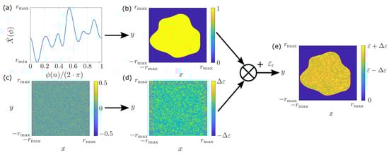 Subsequently, the object is filled with ones everywhere inside the contour and zeros elsewhere, resulting in a binary mask of the object. Since most real-world objects that can be found in GPR systems are strongly inhomogeneous, randomized objects cannot be modeled by setting the relative permittivity to a constant value. One can account for this fact by generating two-dimensional noise like in Figure 3c and applying a two-dimensional Gaussian filter, which results in the distribution shown in Figure 3d. Here, the values inside the matrix are scaled to an interval  by Equation (11), which accounts for the dispersion of the permittivity within a given interval. Subsequently, the final object is formed by multiplying the filtered noise in Figure 3d by the binary mask in Figure 3b. Thereby, the filtered noise is set to zero everywhere outside the object. Furthermore, we add a mean relative permittivity value , while we obtain the final object in Figure 3e, which contains a random contour and a randomized relative permittivity distribution.