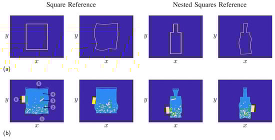 Figure 5 shows some results for the procedure in the case of a square reference on the left side and a reference consisting of two nested squares on the right side. Here, the parameters  and  were selected as random curves, following the approach in Section 4.1. For instance, for the container, the parameter  was calculated using a standard deviation of . It is clearly visible that the deformed objects are still closed contours, while the original reference has a strong influence on the final shape of the object. For instance, the number and positions of the edges remain, while straight lines are mapped onto curves. In the following, we will use the two references to build randomized IED models, with some realizations shown in Figure 5b. Here, the mine was modeled as a random plastic container built from an object close to a rectangle for the two mines on the left side. On the other hand, one can build bottle-shaped IEDs from the nested squares reference as shown for the two objects on the right side. In practice, however, IEDs usually have a symmetrical container, as IEDs are usually made from everyday objects, and most available containers are made symmetrically. Therefore, the deformed contours were mirrored to ensure the container of the mine was symmetric. Aside the container, the mine includes the explosive material, a small air gap between the explosive material and the containment, as well as a detonator and a battery, which are used to trigger the explosion. Furthermore, in practice, mines can be filled with additional small pieces of metal to increase the destructive power of the mine when detonated.