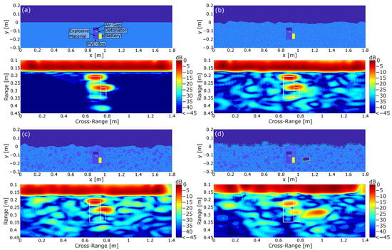 Figure 7 shows four different ground scenes and the related normalized radar images obtained from the simulation after applying a range and cross-range compression on the simulated raw data. Here, the complexity of the scenes increased from a homogeneous lossless ground material with a flat surface in Figure 7a to a more complex measurement environment with numerous additional scatterers and vegetation in Figure 7d. The mine was approximated as a simple rectangular plastic container including the explosive material as well as a metal detonator and an air gap. Furthermore, the mine model included a simplified battery package, which is typically required to trigger the explosion. However, the modeling of more complex mine models is crucial and will be discussed in the further proceedings of this paper.
