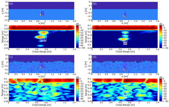 Simulated ground scenes with the corresponding normalized SAR images including the contour of the mine. (a) Reference image containing the mine model in a perfectly homogeneous material. All losses were neglected. (b) Mine model in an inhomogeneous soil material with a non-planar surface, considering dielectric losses. (c) Mine model under the considerations of additional dielectric scatterers inside the ground material. (d) Complete scene under the assumption of additional metal interferers and vegetation on the earth surface. [].