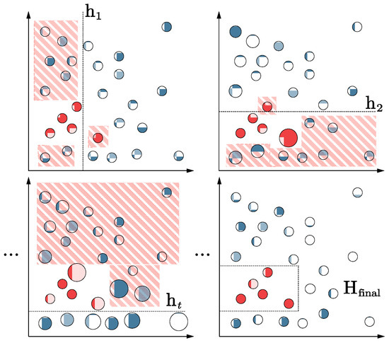 The AdaBoost [35] algorithm combines weak classifiers to obtain strong classifiers. The algorithm is implemented by varying the data distribution. The weight values are determined by the accuracy of each sample in the current training set and the accuracy of the last overall classification. The new dataset with modified weights is sent to the next classifier for training, and finally, the classifier obtained from each training is fused as the final decision classifier, a weighted iterative process, as shown in Figure 4. The shaded samples are those that were misclassified and whose weights required changing. The samples, represented by circles of different colors, should have been categorized separately.
