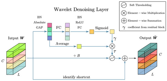 In this paper, residual shrinkage networks were used to learn thresholds and fine-tune parameters. We named this the wavelet denoising layer (WDL); its network structure is shown in Figure 6: