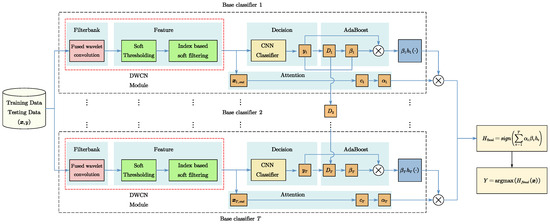 - We propose a modified version of the AdaBoost ensemble learning algorithm based on the attention mechanism. In addition to the weights assigned by the original AdaBoost algorithm, more attention is allocated to the optimal base classifier under the current conditions through similarity analysis of filtered samples. The final diagnosis model constructed according to this method is named the Denoising Fault Diagnosis Attention Network (DFAN). This approach further reduced the interference of raw sample noise on fault diagnosis and enabled the final classifier to be very generalizable and robust.