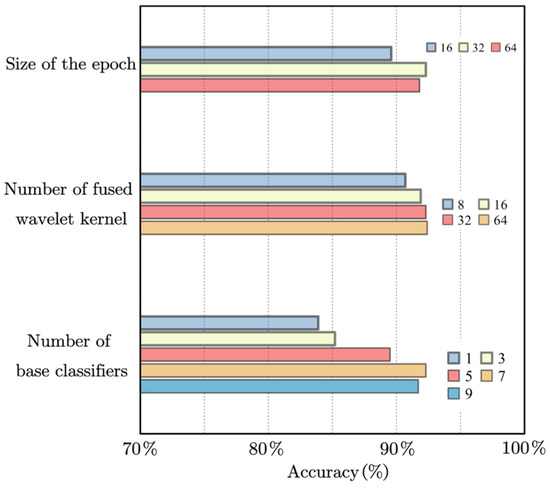 When there was only one base classifier, the proposed method degenerated into a WCNN-like model. When the number of base classifiers was increased, the accuracy rate increased rapidly, achieving its highest value at 7, which was 10% higher than when there was only one base classifier.
