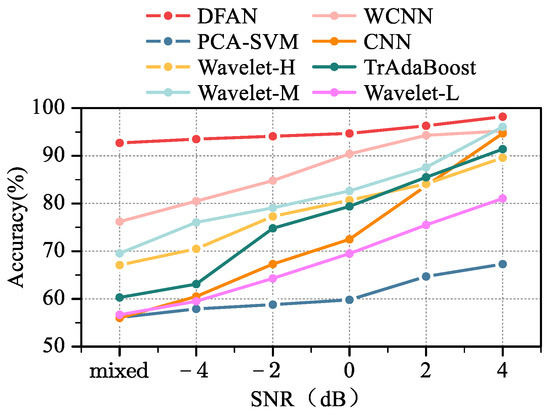 The number of samples in each sample set was 1000, and the noise included was −4 dB, −2 dB, 0 dB, 2 dB, 4 dB, and mixed noise, respectively. The distribution of various fault conditions in the sample set was also balanced. The nine fault diagnosis networks were the same as those described in Section 4.1.2 for comparison.