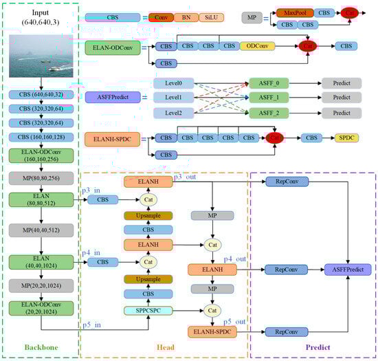 One needs to strengthen the network’s feature extraction capabilities and optimize information flow to enhance the model’s effectiveness in detecting ships under challenging sea conditions. Therefore, this paper optimizes the backbone, head, and prediction network components of YOLOv7 by leveraging the advantages of ODConv, SPDC, and ASFF. As illustrated in Figure 1, the YOLO-Vessel model comprises three main components: the ELAN-ODConv backbone network structure, ELANH-SPDC head structure, and ASFFPredict prediction network structure.