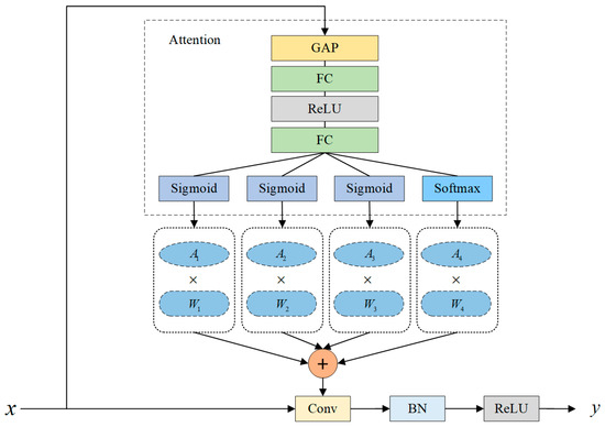 Figure 2 shows that ODConv learns the four attention weights of the convolutional kernel in parallel along four dimensions. The input feature map is first subjected to a global average pooling (GAP) operation and then passed through a Fully Connected (FC) Layer—ReLU Activation Layer—Fully Connected (FC) Layer structure. Finally, a set of attention weights is obtained at the output of the sigmoid and softmax activation function layers. Specifically, , , and are generated by the Sigmoid activation function, i.e.,