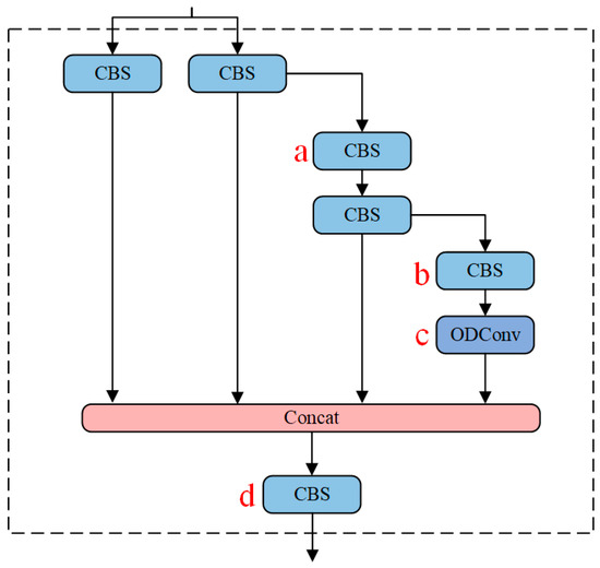Structure of ELAN-ODConv. The ODConv is introduced into the ELAN module, where positions a, b, c, and d are highlighted in red, representing the locations where ordinary convolutions are replaced with ODConv.