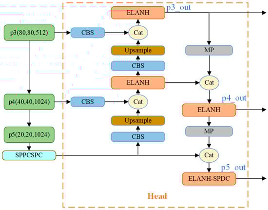 YOLO-Vessel’s head network consists of the PANet structure, the SPPCSPC module, and the ELANH-SPDC module. The feature information extracted from the backbone network is generated in the p3_in, p4_in, and p5_in layers at the three scales of 80 × 80, 40 × 40, and 20 × 20, respectively, and output to the head network. Subsequently, the 20 × 20 scale feature map is first upsampled using the SPPCPSC module to perform a Concat operation with the 40 × 40 scale feature map. Then, the output features are upsampled to perform a second fusion with the 80 × 80 scale feature map to further the fusion between adjacent scales of the feature map. However, in the multiscale structure, as the depth of the network grows, the location information of the feature map is weakened, and the resolution of the map gradually decreases, which leads to the degradation of the model’s detection performance. Accordingly, we introduce an ELANH-SPDC module, incorporating the SPDC module into the head network’s tail. This enhancement aims to sharpen the model’s attention towards low-resolution and small objects, particularly in remote sea areas, while also boosting recognition performance for low-resolution feature maps.