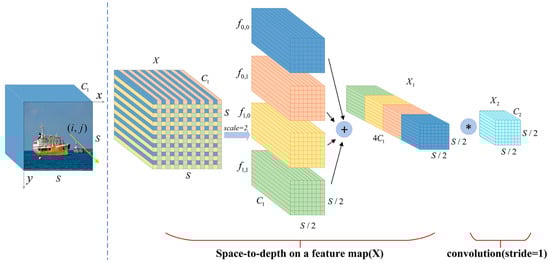 The graphical process is given in Figure 5, where four subfeature maps , , , are obtained when , each with size , which is equivalent to twice the downsampling of the original feature map . Then, all the subfeature maps are connected along the channel dimension to obtain the intermediate feature map , where the spatial dimension is reduced by a scale factor, and the channel dimension is increased by a scale factor. The space-to-depth layer converts the original feature map into an intermediate feature map with feature discrimination information. A convolutional layer with a filter is added in Figure 5 to achieve further transformation from the intermediate feature map to the final feature map . The step size of this convolutional layer is set to 1 to retain the maximum amount of discriminative feature information. Therefore, we introduce the SPDC structure into the ELANH structure of the head network, which can effectively improve the detection performance of the model for low-resolution and small ships at sea.