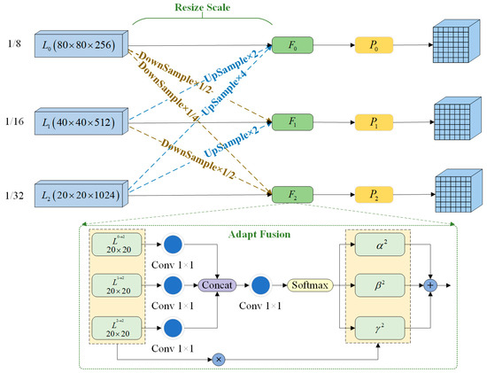 We select three layers of feature map output from the head network for fusion. In Figure 6, , , and denote the feature maps involved in adaptive fusion. Direct feature fusion cannot be performed since these three feature maps have different scales and channels. Therefore, the resolution and channels of each feature layer need to first be adjusted to be the same. Taking layer fusion as an example, the fused feature map is labeled , and then, the three spatial weights from , , and to are labeled , , and , respectively. The expressions are as follows: