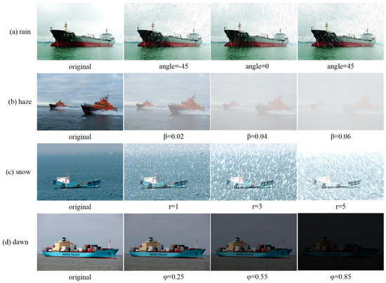 Synthesized ship images in adverse maritime weather conditions. (a) Rainy weather images, including the original and rainy images with rain streak angles of −45 degrees, 0 degrees, and 45 degrees. (b) Haze images, including the original image and images with haze concentrations of 0.02, 0.04, and 0.06. (c) Snowy weather images, including the original and snowy images with 1, 3, and 5 snow levels. (d) Dawn images, including the original and dawn images, have low light coefficients of 0.25, 0.55, and 0.85.