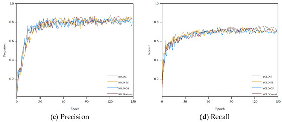 We conducted several experiments on a synthetic weather ship dataset. Figure 8 shows the mAP, precision, and recall curves for all detectors during model training. All curves rise gently and converge quickly, indicating that the model is well-trained and not overfitted. As depicted in Figure 8a,b, the overall training curves exhibit minimal fluctuations. However, Figure 8c,d reveal more significant volatility during the ascending phase of the overall training curve, although these fluctuations minimally impact detection accuracy. Due to the introduction of ODConv and SPDC, the model’s detection capability has been enhanced. YOLO-Vessel improves precision from 82.8% to 83.7% compared to the original YOLOv7 model. Additionally, after training for 150 epochs, the recall, mAP@0.5, and mAP@0.5:0.95 indices reach 70.2%, 74.5%, and 53.6%, respectively. The model performs well in detecting ship images.