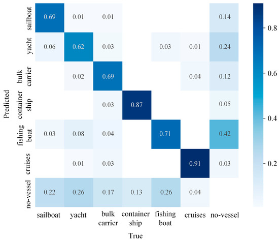 During the individual testing process for each image, predictions and actual values for each category were recorded, resulting in a confusion matrix, as shown in Figure 9. It can be observed that there are misclassifications between cargo ships and cruise ships, primarily due to the similar features of these two types of vessels and the blurriness of ships in adverse maritime weather conditions, making them easily confused. To address this, a “no-vessel” category has been added to the detection, representing the absence of any vessel. Fishing boats also experience misclassifications, mainly due to their small size. In complex maritime weather conditions, interference from background noise can easily result in misidentifying fishing boat classes as “no-vessel” classes. Therefore, adverse weather conditions significantly impact the detection of ships.