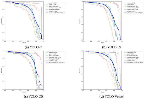 Figure 10 illustrates the Precision-Recall (P-R) curve. The area enclosed by the P-R curve and the coordinate axes in the image represent the mAP value. It can be observed that the mAP value of the YOLO-Vessel is higher than that of other improved models. The improved model shows a slight enhancement at different recall rates, indicating the effectiveness of the proposed improvements in enhancing the ship detection performance of the model.