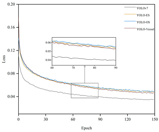 As Figure 11 demonstrates the comparison of the loss values of the original model with different improvements. Specifically, the loss curve of the YOLO-Vessel exhibits a swifter decline during initial training and converges more stably in the final phase compared to the other models, indicating that ELAN-ODConv and ELANH-SPDC can effectively extract features, resulting in a faster decrease in loss values and optimal model detection performance.