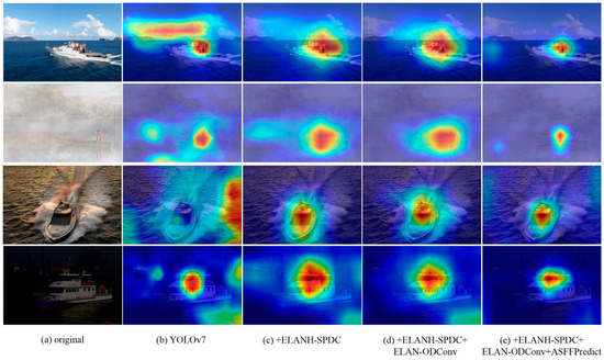 We also validate the effectiveness of introducing SPDC, ODConv, and ASFF. We employ gradient-weighted class activation mapping (Grad-CAM) to visualize heatmaps for the four models, explaining the significance of feature capture in the improved models. In the Grad-CAM heatmaps, deeper colors indicate regions contributing more to ship detection in the heatmap. Figure 12a displays the original image of the target to be detected. As depicted in Figure 12b, the heatmaps of YOLOv7 exhibit poor ship detection performance under adverse weather conditions, with instances of heatmap region misalignment or sparsity. In Figure 12c, introducing the ELANH-SPDC module mitigates the impact of adverse weather or noise to some extent, capturing the approximate location of ships and reducing interference in learning ship features under low resolution. Figure 12d illustrates the continued improvement by introducing the ELAN-ODConv, enhancing the backbone network’s ability to extract ship features and reducing the number of irrelevant regions in the heatmap. Finally, in Figure 12e, introducing the ASFFPredict structure further refines the localization of ship targets, narrowing the heatmap range and indicating an increased focus on ship features.