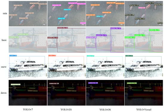 In the rainy and hazy conditions shown in Figure 13, YOLOv7 has missed ships because of the small size of individual vessels and the less distinct hull outline, which is very close to the texture of the background. In addition, in the snow and dawn conditions shown in Figure 13, the detection performance remains poor because YOLOv7 does not locate the target size well, and hence the confidence level of detecting the ship targets is low. In contrast, YOLO-ES has good detection results and can detect multiple and small ships simultaneously, indicating the effectiveness of ELANH-SPDC, but it detects frame calibration imprecisely. In Figure 13, YOLO-OS and YOLO-Vessel can successfully identify the small target position, demonstrating the efficacy of ASFFPredict and ELANH-ODConv. In addition, YOLO-Vessel can identify more small target ship positions with smaller objects, proving that YOLO-Vessel is more robust in images of ships under extreme adverse weather conditions.