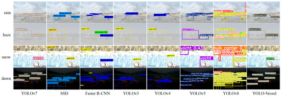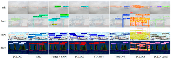 Comparisons of ship detection performance in rainy, hazy, snowy, and dawn weather are shown in Figure 14, Figure 15 and Figure 16. The other models in the comparison can achieve accurate ship detection in adverse weather, but errors can occur in other complex sea conditions. Due to the sizeable similar ship outline background interference and small ship occlusion, YOLOv8 cannot capture the features of small ships well, and multiple misidentified detection frames appear, resulting in less accurate ship detection at sea. In the dawn environment, the SSD algorithm misses many ships. The Faster R-CNN algorithm has improved at detecting localization recognition, but the target confidence still needs to be higher. YOLOv4 misses ship detection in the snowy environment, while YOLOv3 and YOLOv5 have better feature extraction ability, but there is a false detection situation, which may mistakenly detect the background as a ship. In contrast, the YOLO-Vessel model improves the prediction network by using ASFF, enabling it to fuse targets’ structural features at different scales, detect more ships in complex sea conditions, and achieve better detection performance.