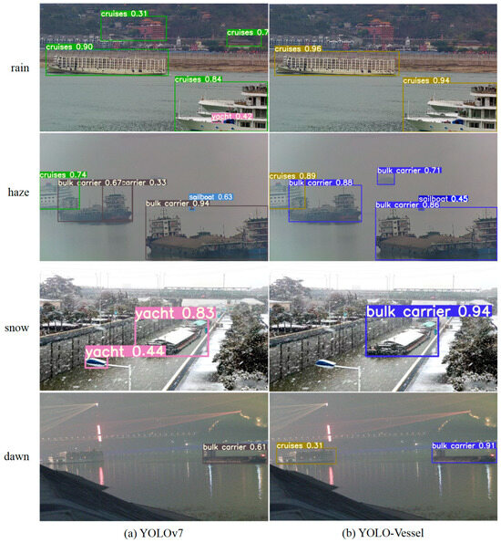 Ship detection experiments in authentic adverse weather images. From left to right: ship detection results for (a) YOLOv7 and (b) YOLO-Vessel in rainy images, haze, snow, and dawn weather, respectively.