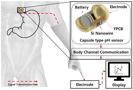 These SiNW-based pH sensors enable the development of miniaturized sensors with enhanced sensitivity for use in implantable medical devices [21]. For instance, the diagnosis of gastroesophageal reflux disease necessitates long-term esophageal pH monitoring [22]. Among the existing methods, sensors in a capsule form exhibit low sensitivity, while catheter-based sensors induce discomfort for the user [23]. In these cases, SiNW-based pH sensors, which are highly sensitive, can be utilized as a viable alternative. This method can be significantly improved by miniaturizing the device, thereby reducing the discomfort experienced by patients during the monitoring process. Furthermore, the advancements in pH monitoring technology are not limited to the esophagus. Similar methodologies can be applied to measure the pH levels in the intestines, providing valuable data for the diagnosis and treatment of various gastrointestinal conditions. This approach opens new avenues for more patient-friendly and accurate diagnostic procedures. Our approach integrates the sensor into the BCC circuit, enhancing the functionality and efficiency of these devices, as shown in Figure 1. BCC uses the human body as a conductive path, resulting in lower power consumption and the transmission of information [24,25]. This helps to extend the battery life of devices. Also, data transmission through the human body reduces the risk of external interference or hacking, making it highly secure. BCC technology can be easily integrated into small devices, making it ideal for medical devices that are implanted or worn on the body [26,27,28]. Therefore, in our research, we tried to implement the sensor system by applying this BCC circuit.