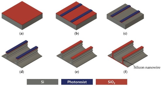 Previously reported top-down fabrication process for vertically stacked silicon nanowires: (a) chemical vapor deposition of TEOS oxide; (b) photolithography of mask for silicon nanowires; (c) etching silicon oxide; (d) silicon deep reactive ion etching using BOSCH process; (e) removal of residual photoresist using plasma ashing; (f) thermal oxidation to make the silicon nanowires suspended.