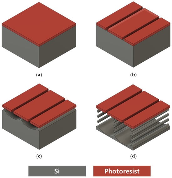 Top-down fabrication process for vertically stacked silicon nanowires: (a) photoresist coating; (b) photolithography of mask for silicon nanowires; (c) silicon deep reactive ion etching using BOSCH process; (d) vertically stacked silicon nanowires fabricated solely via DRIE.