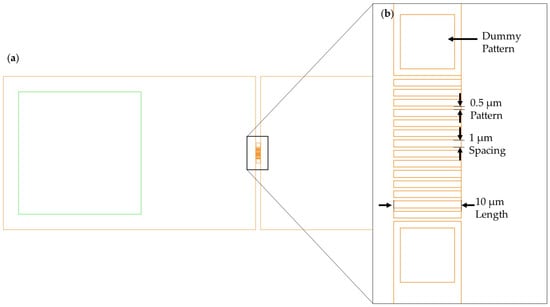 Photomask layout for silicon nanowire fabrication using DRIE: (a) general schematic of the photomask design, with the yellow outlines indicating the primary etching area and the green outlines indicating the electrode deposition area; (b) a detailed view of the highlighted section in (a), illustrating the features of the photomask, including the patterns of the silicon nanowires, the spacing between adjacent patterns, and a dummy pattern to eliminate the micro-loading effect.