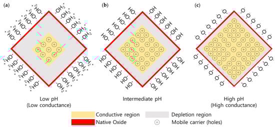 In a low-pH solution, where H+ ions are abundant, the oxide surface undergoes protonation, leading to the acquisition of a positive charge. Given that p-type silicon nanowires primarily exhibit holes as the major carriers, this process results in an expansion of the depletion region, causing a reduction in the conductive region and a subsequent decrease in conductance. Conversely, in a high-pH solution, where the H+ ion concentration is lower, the deprotonation of hydroxyl groups occurs, leading to accumulation and an increase in the conductive region. This results in enhanced conductance. pH level can be calculated by measuring the change in drain current caused by the change in conductance.
